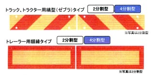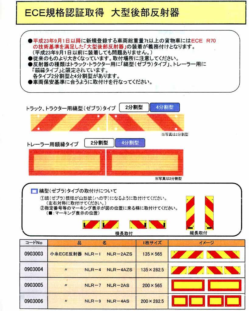 ●平成23年9月1日以降に新規取得する車両総重量7トン以上の 貨物車にはECE R70の技術基準を満足した「大型後部反射器」の 装着が義務付けとなります。 ●従来のものより大きくなっています。取付場所に注意してください。 ●反射器の種類はトラック・トラクター用に「縞型(ゼブラ)タイプ」 トレーラー用に「額縁タイプ」と限定されています。 各タイプ2分割型と4分割型があります。 ●車両保安基準に合うように取付けを行ってください。 |