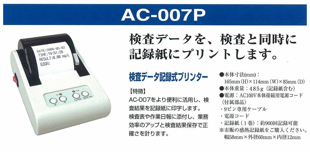 ●AC-007をより便利にし、検査結果を記録紙に印字します。 検査表や作業日報に添付し、業務効率のアップと検査結果保存で 正確さを計ります。 |