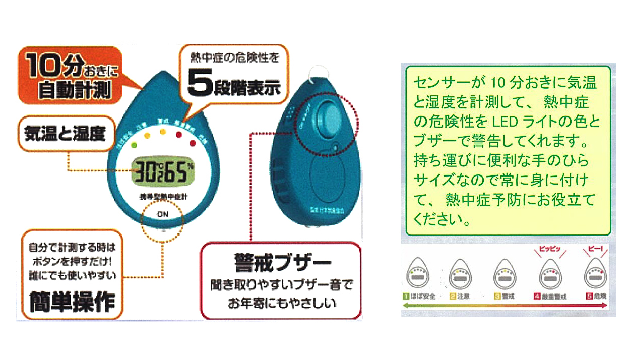 ●熱中症の予防と対策に! ●5段階のLEDライトと警戒ブザーでお知らせ |