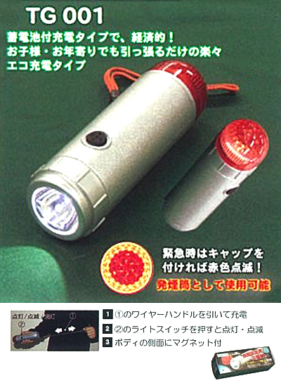 ●「車両緊急時」「防災時」の備えに! ●ご家庭での常備用・防災用ライトとして ●夜間のパンク修理など、車両不具合時の作業灯として ●更に!車両の緊急時に従来の発炎筒と同等の機能を発揮 ●蓄電池付充電タイプで経済的! ●お子様・お年寄りでも引っ張るだけの楽々エコ充電タイプ ●緊急時はキャップを付ければ赤色点滅! |