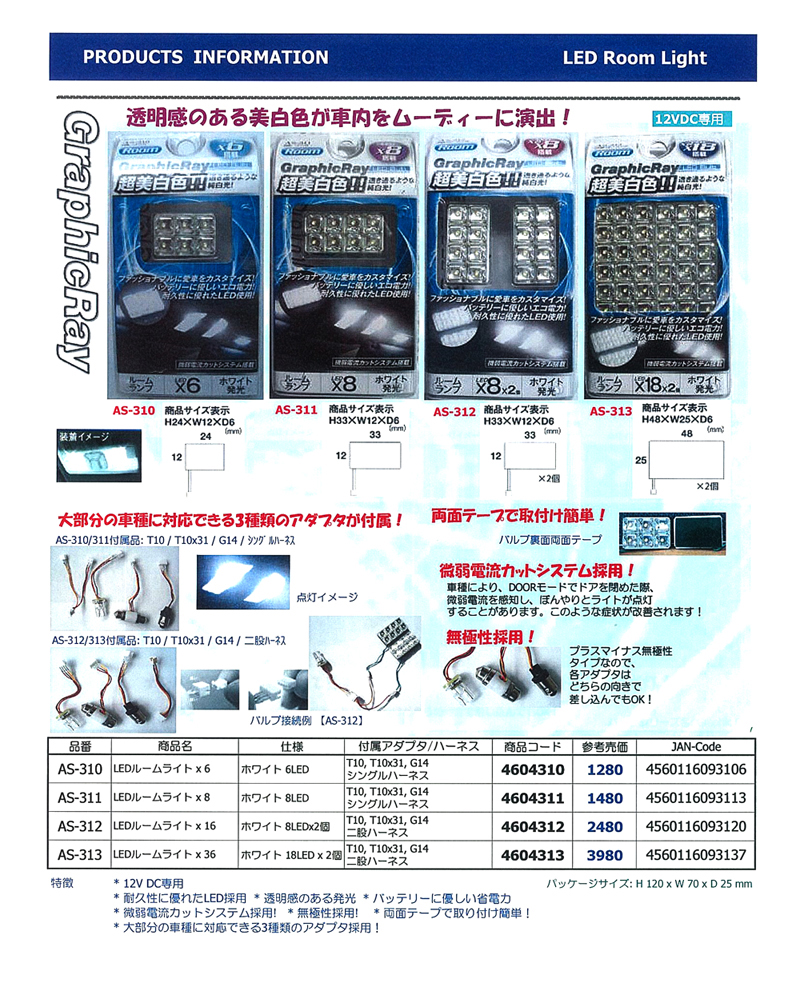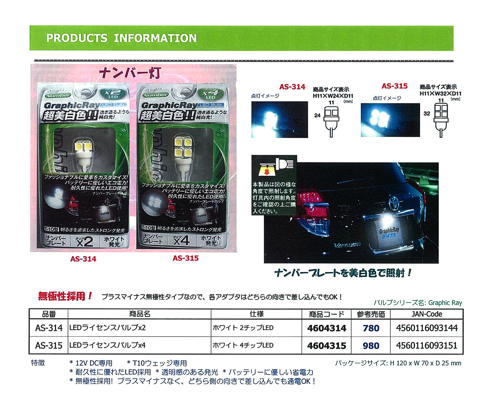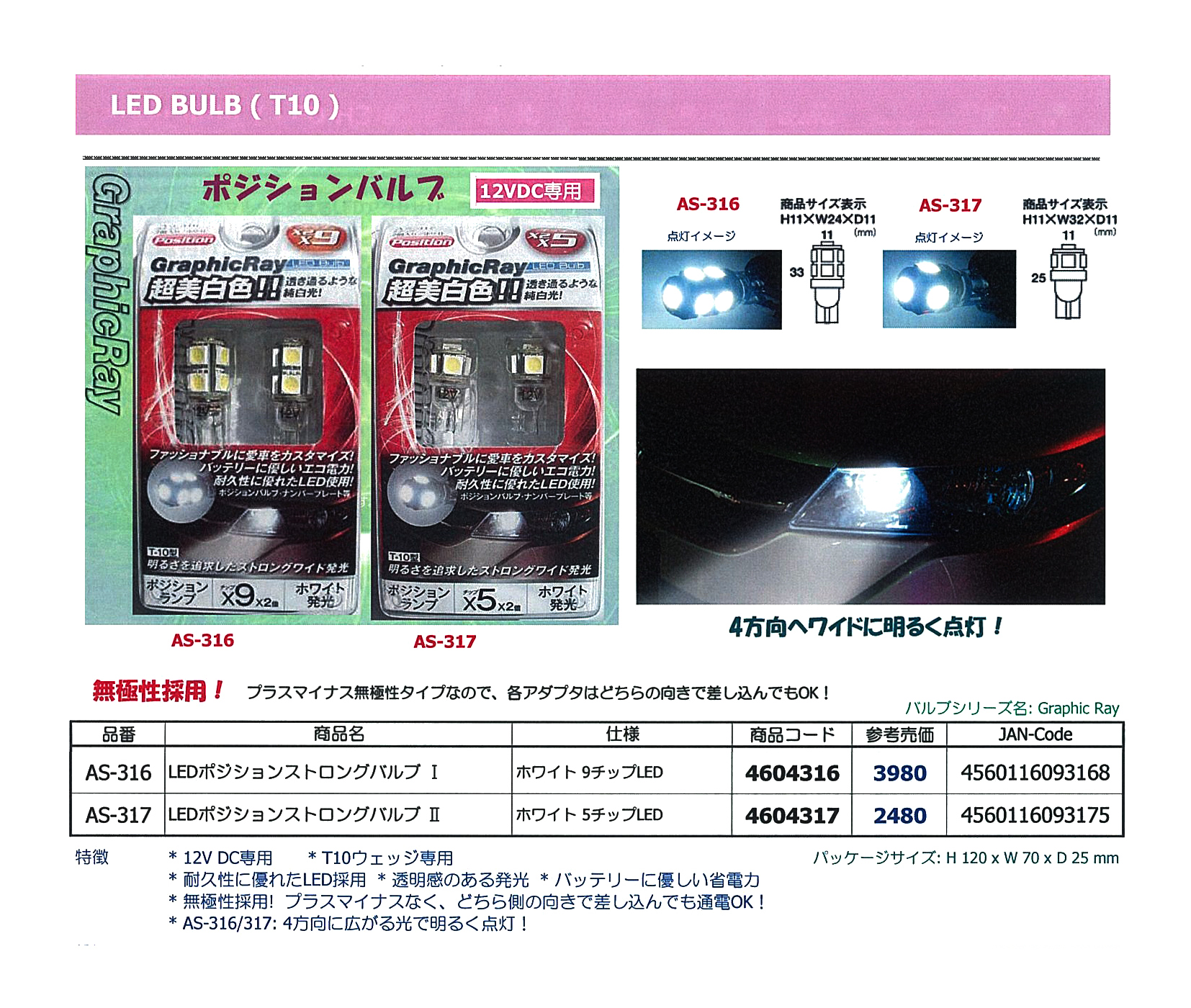 ●4方向へワイドに明るく点灯! ●T10ウェッジ専用 ●耐久性に優れたLED採用 ●透明感のある発光 ●バッテリーに優しい省電力 ●無極性採用!プラスマイナスなく、 どちら側の向きで差し込んでも通電OK! |