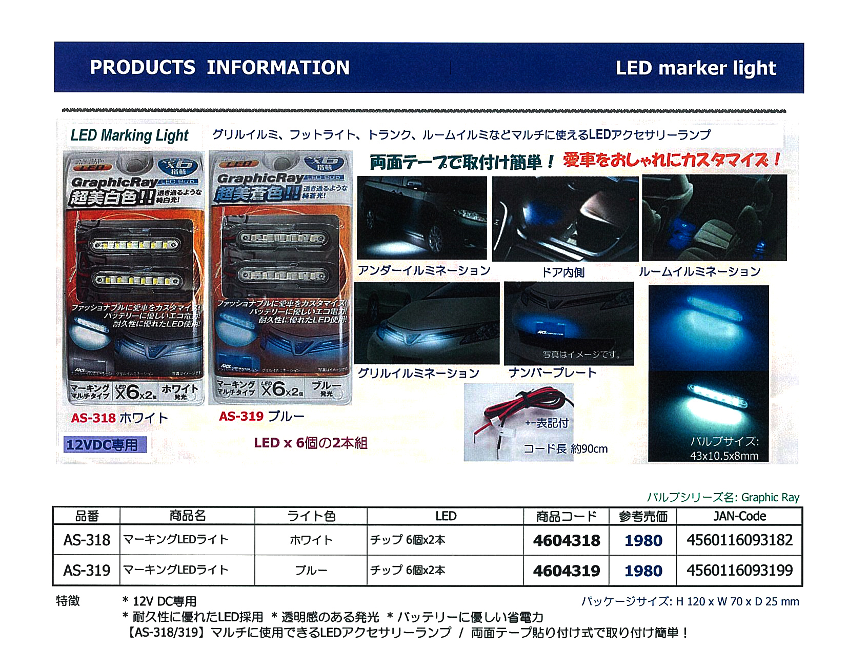 ●グリルイルミ、フットライト、トランク、ルームイルミなど マルチに使えるLEDアクセサリーランプ ●愛車をおしゃれにカスタマイズ ●両面テープで取り付け簡単 ●耐久性に優れたLED採用 ●透明感のある発光 ●バッテリーに優しい省電力 |