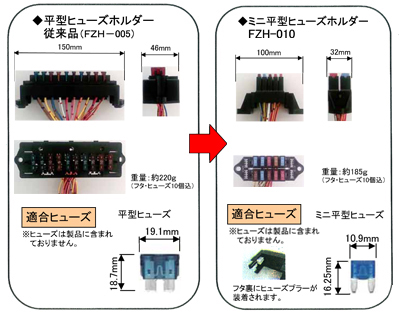 ●従来品(平型ヒューズホルダーFZH-005)に比べてコンパクトになり、設置に場所をとりません。 従来品(FZH-005)に比べ、長さ50mm、幅22mm小さくなり、35g軽くなります。