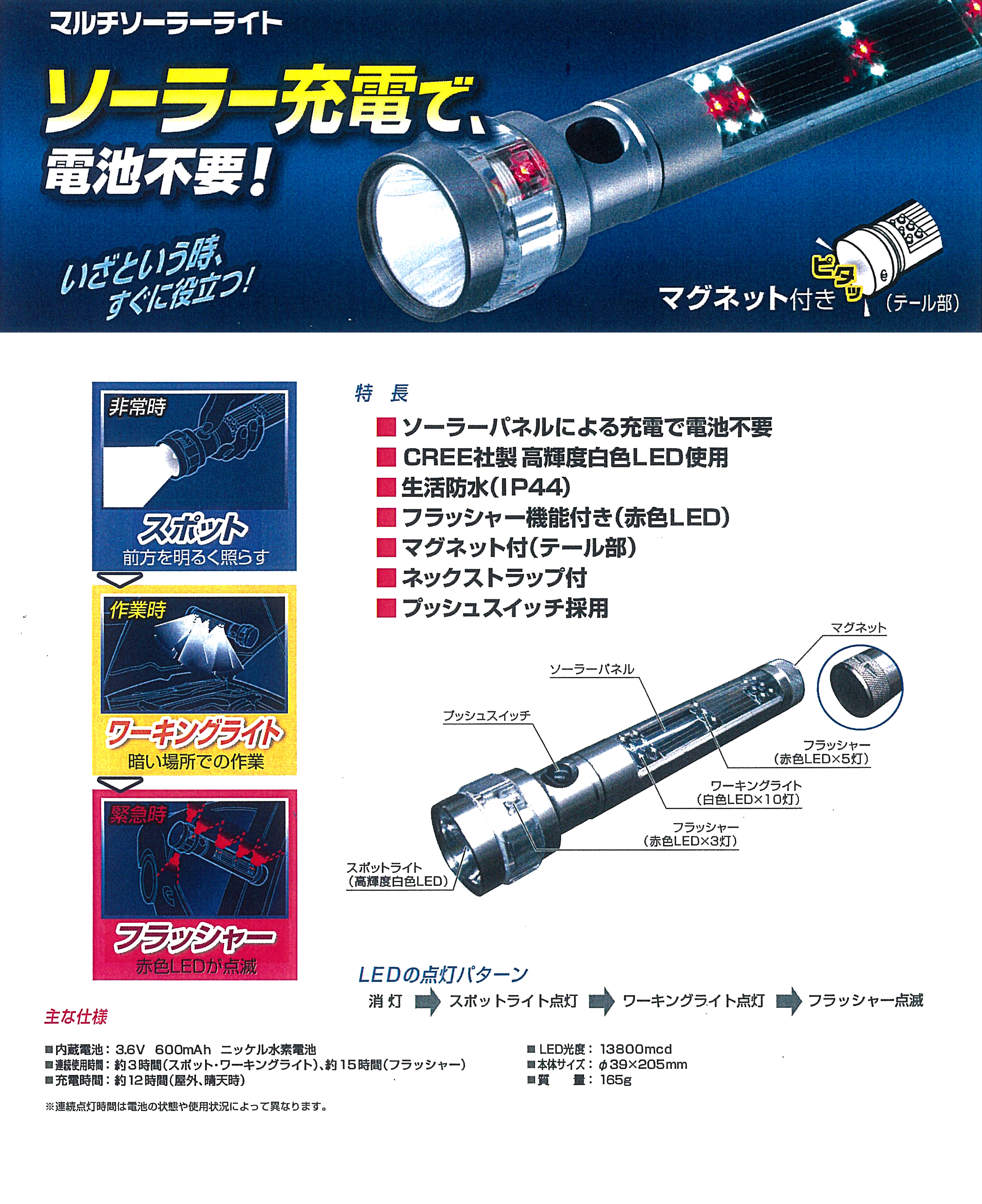 約3時間(スポット・ワーキングライト) 約15時間(フラッシャー) ※連続点灯時間は電池の状態や使用状況によって異なります。 |