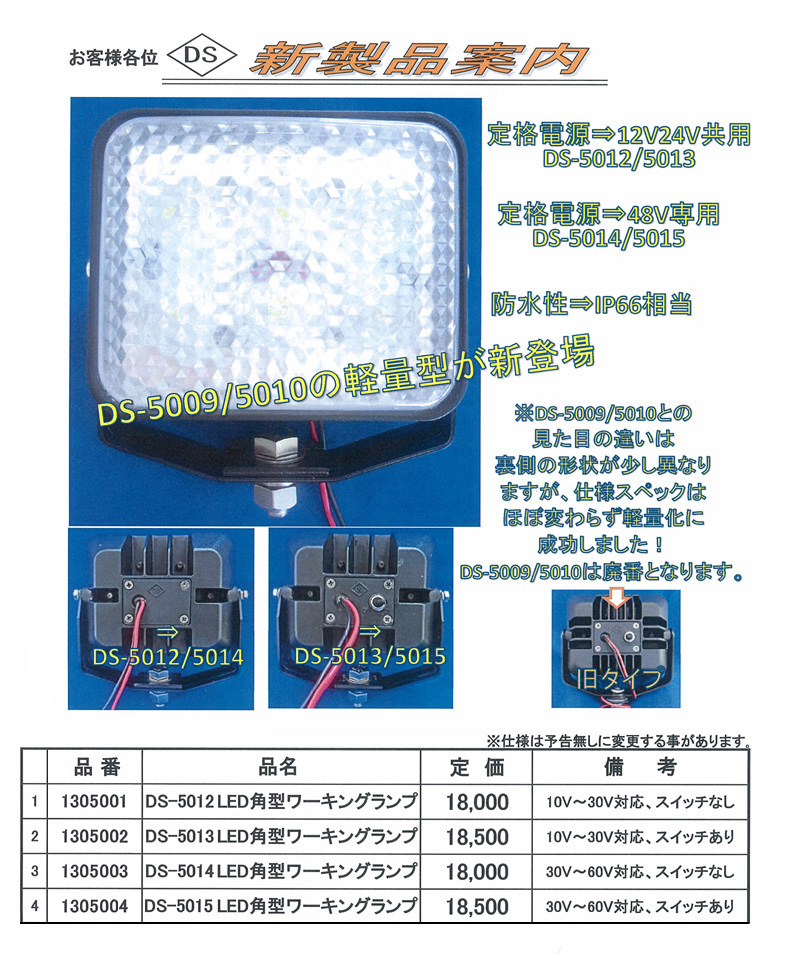 ●定格電源⇒12V24V共用:DS-5012/5013 ●定格電源⇒48V専用:DS-5014/5015 ●防水性⇒IP66相当 ※DS-5009/5010との見た目の違いは裏側の形状が少し異なり ますが、仕様スペックはほぼ変わらず軽量化に成功しました! ※DS-5009/5010は廃番となります。 (品番をクリックすると商品詳細へ移動します) |