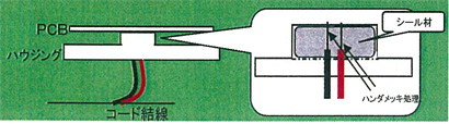 コード被覆部を剥きコード芯線部にハンダメッキ処理します。 メッキ処理部とコード被覆部の隙間もシール材で封します。