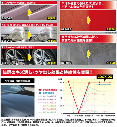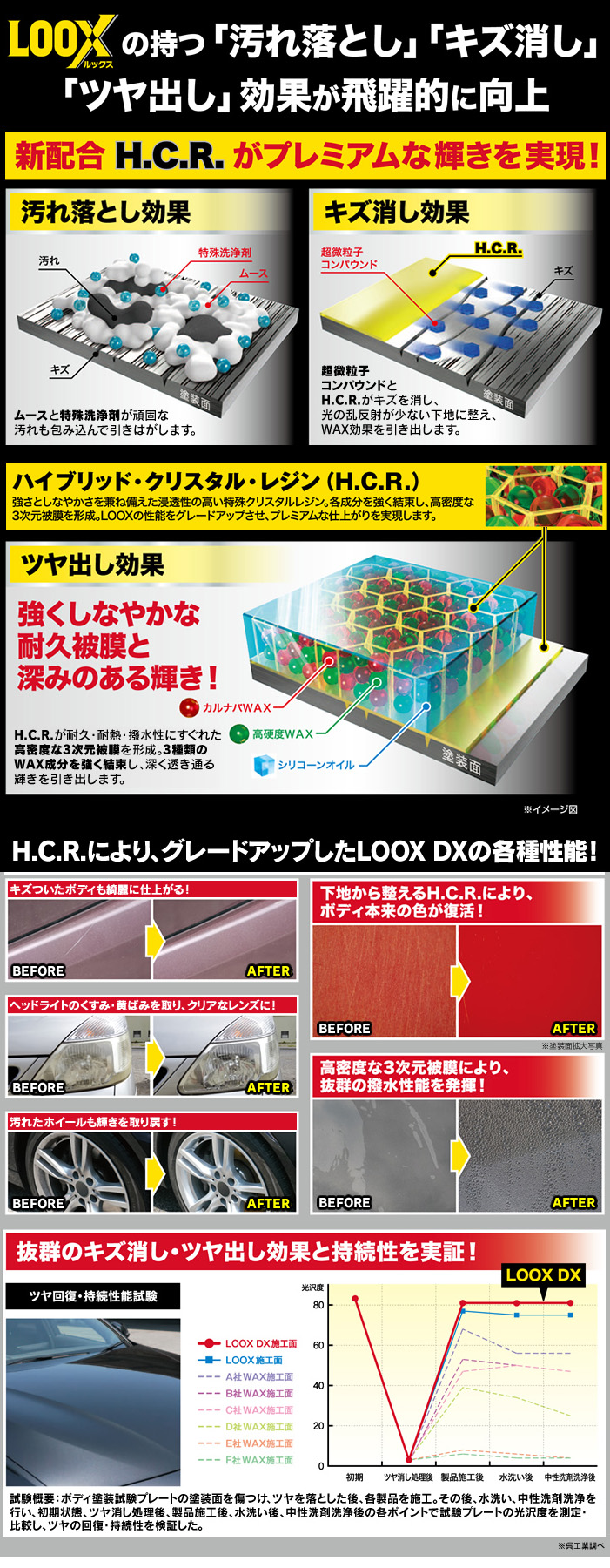 新成分H.C.R(ハイブリッド・クリスタル・レジン)を配合し、ボディ、ホイール、ヘッドライトカバー、メッキパーツなど、様々なパーツを下地からしっかりと整え、3次元被膜を形成し、透き通るような深みのある輝きを与えます。 |