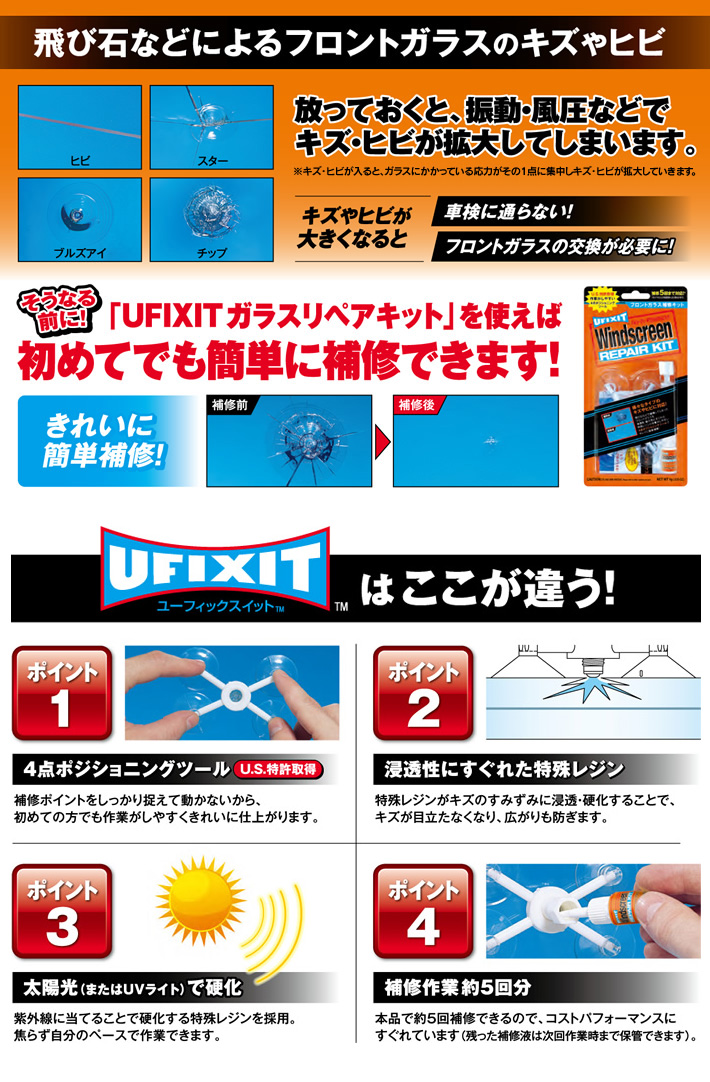 浸透性にすぐれた特殊レジンがキズに浸透・硬化することで、キズの広がりを防ぎ、目立たなくします。 |