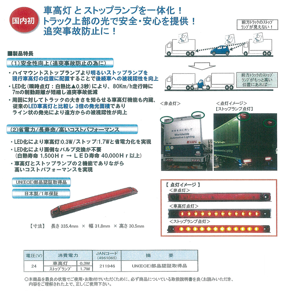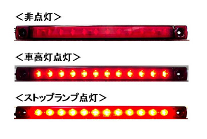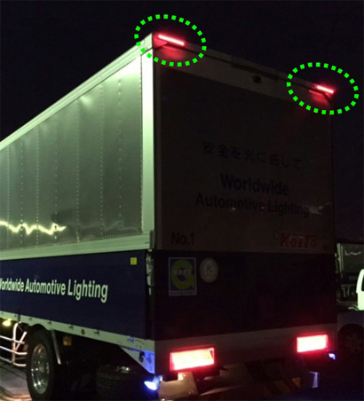 従来のLED車高灯と比較し、3倍の発光面積であり、ライン状の発光により遠方からの被視認性が向上 |