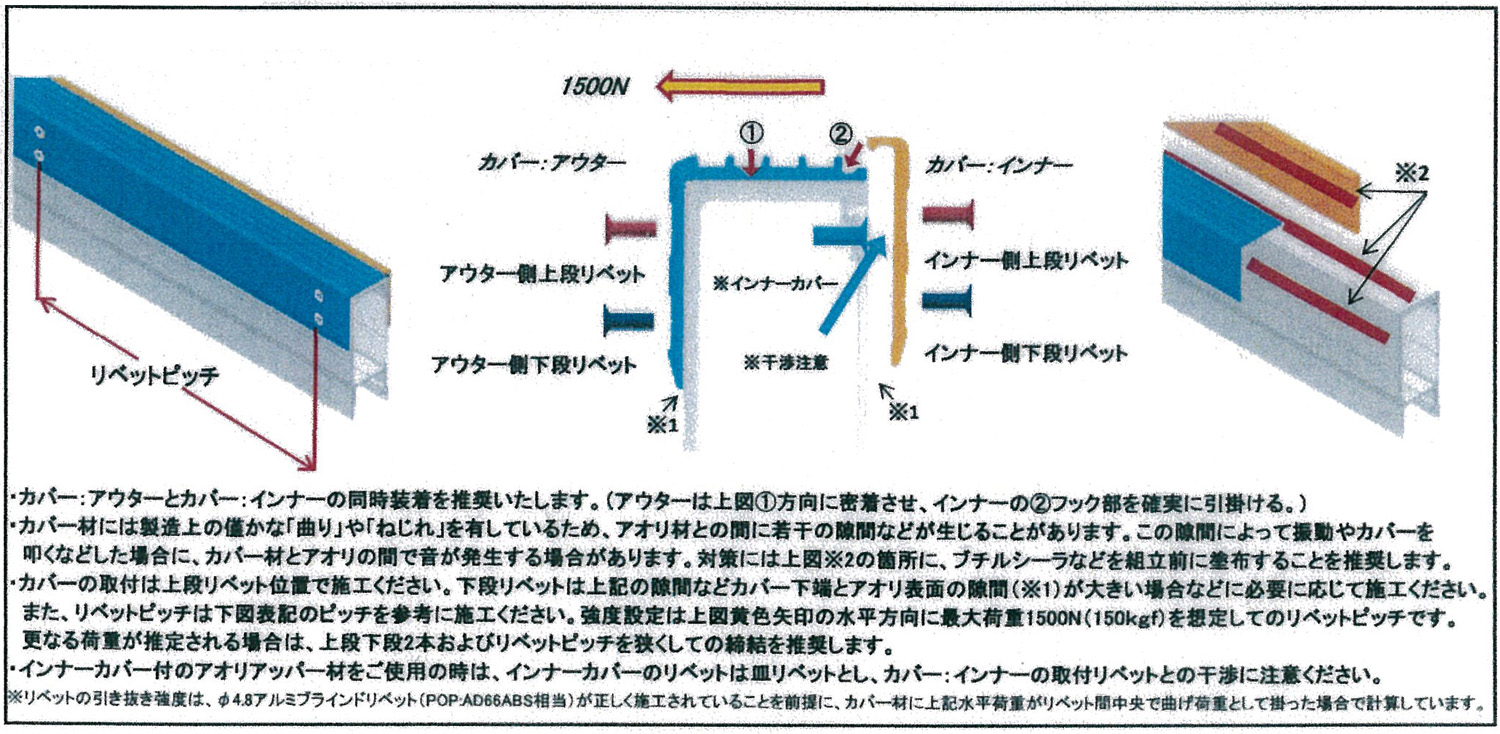 カバーの取付は上段リベット位置で施工して下さい。 |