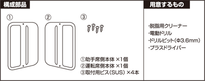 助手席用・運転席用1セット入り 両面テープと取付用ビスでガッチリ取り付け 信頼の日本製 ![]() |