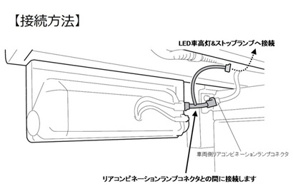 ・従来LED車高灯&ストップランプを取り付ける場合、車体側ハーネスの加工が必要でしたが、分岐ハーネスをリアコンビネーションランプコネクタとの間に接続することにより、車体側ハーネスの加工が不要となります。 |