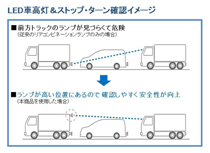@車両上端部に取付け、リアコンビネーションランプと連動し車高灯、ストップ、ターン(右左折時)、ハザードを点灯 周辺車両・歩行者に進路変更・停車をいち早くアピールし、巻き込み事故/追突事故の防止に役立ちます!